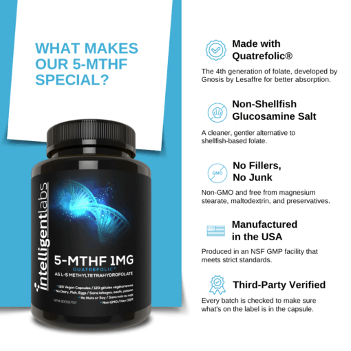Our 1mg 5-MTHF supplement is manufactured at a NSF GMP-certified facility in the United States.