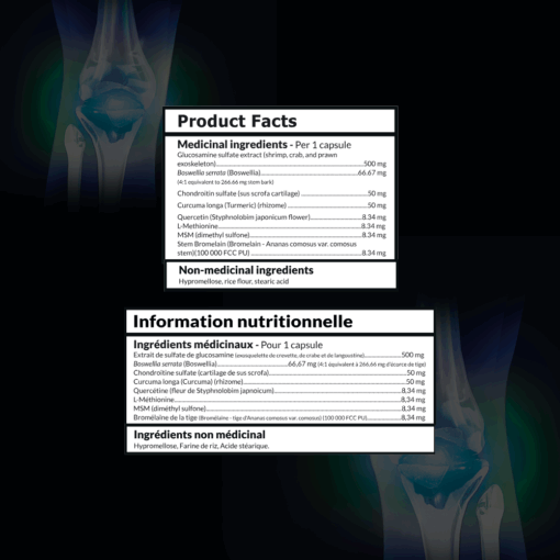 Ingredients per serving: 1500mg Glucosamine Sulphate (with 1050mg base glucosamine), 200mg Boswellia Extract, 150mg Chondroitin Sulphate, 150mg Turmeric Root (Curcuma Longa), 25mg Quercetin, 25mg MSM (Methylsulfonylmethane), 25mg Methionine, 25mg Bromelain