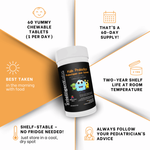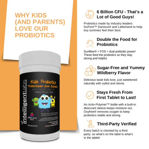 Each Intelligent Labs Kids’ Probiotics tablet contains the prebiotics Sunfiber® and FOS. Prebiotics are non-digestible fibers that act as food for probiotics.
