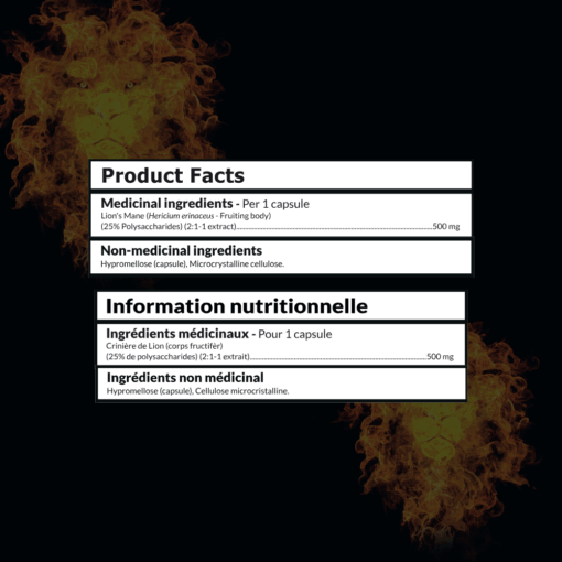 Ingredients: Lion’s Mane Mushroom Extract (Hericium erinaceus) Fruiting Bodies (Std. to min. 25% Beta Glucans)