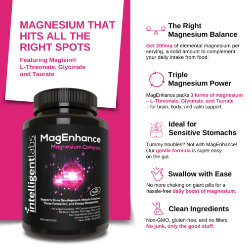 To make sure you’re getting enough magnesium, take MagEnhance. It’s the most complete magnesium supplement with 3 forms of bioactive magnesium: