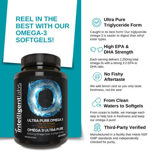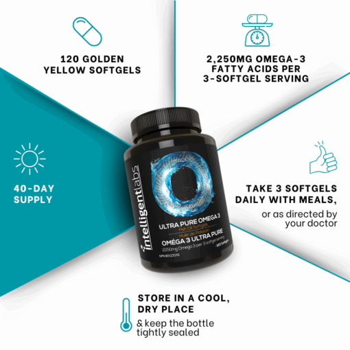 A serving of our Ultra Pure Omega-3 supplement gives you 1,224mg EPA, 816mg DHA, and 210mg other TG fatty acids for a total of 2,250mg of the highest quality fish oil!