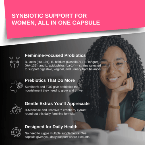 Taking this probiotic will make more ‘good’ bacteria in the vagina. This will reduce your risk of vaginal infections, such as bacterial vaginosis, vaginal thrush, and UTIs.