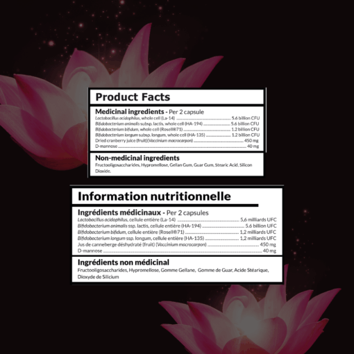 Ingredients per serving: Proprietary Blend of L. acidophilus La-14®, B. lactis Bl-04®, B. bifidum Bb-06®, B. longum Bl-05® (6 Billion CFU per serving*); Proprietary Blend of Crantiva™ Cranberry Juice Powder, Sunfiber® (Partially Hydrolyzed Guar Gum), Fructooligosaccharides (FOS), and D-Mannose (425mg per serving*)